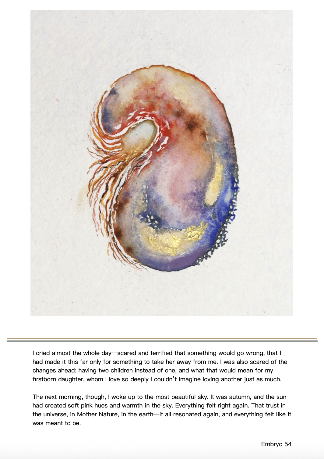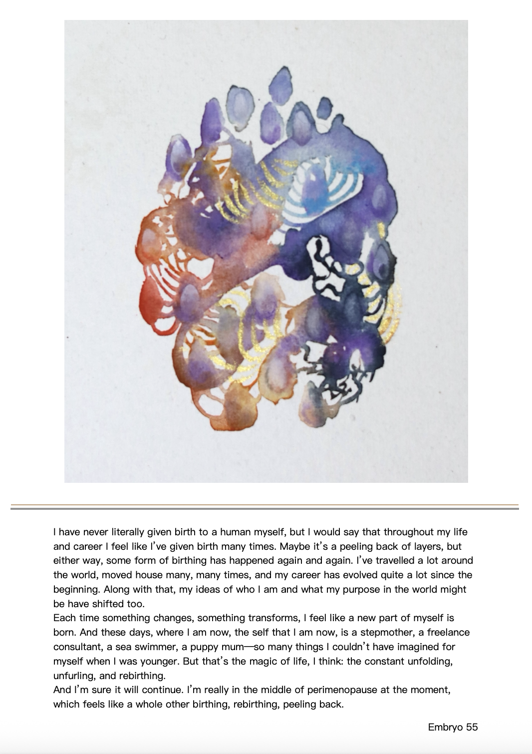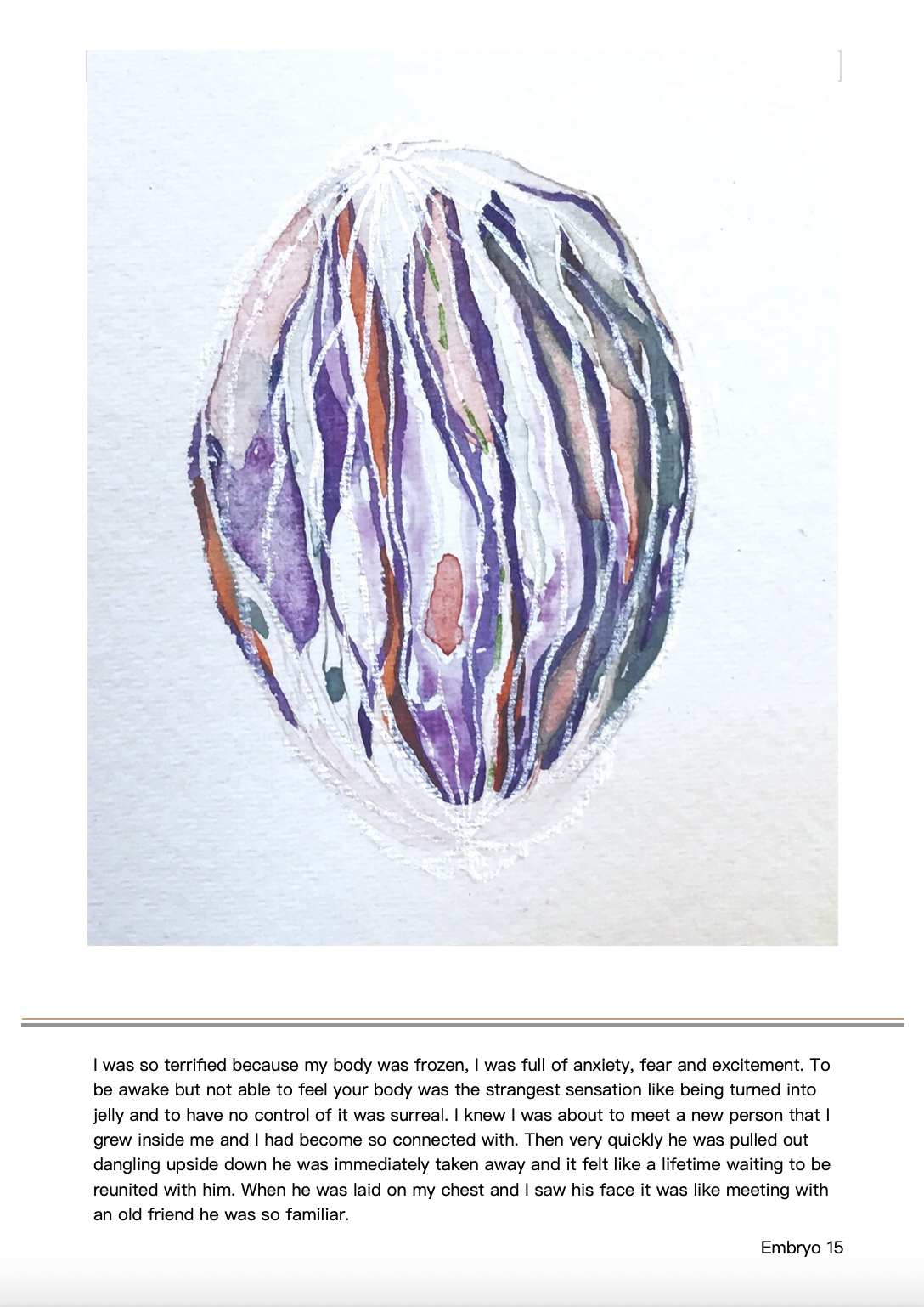 Each embryo is painted with watercolour on 20 × 20 cm Khadi paper. The project began during my own transition into the new identity of a mother and through natural conversations with other mothers about their birth stories. These intimate and profound exchanges are encoded into each embryo—each form encapsulates the story, the way it was told, and the energy it holds.