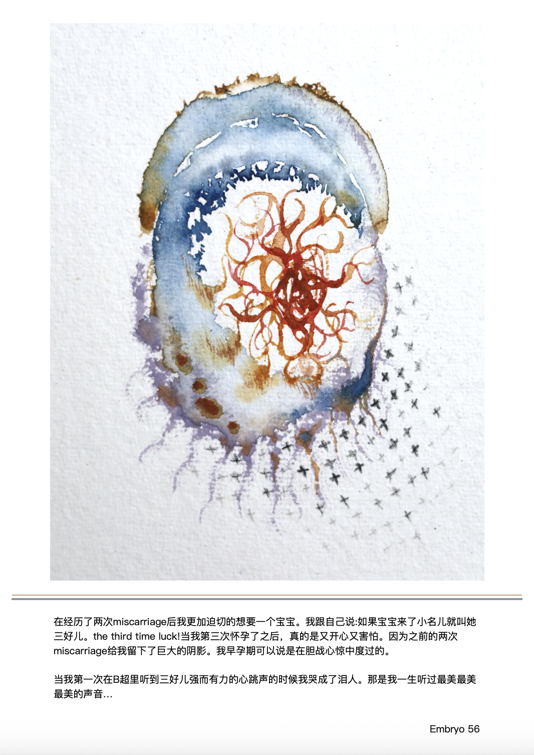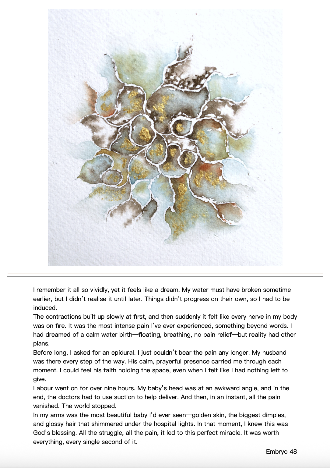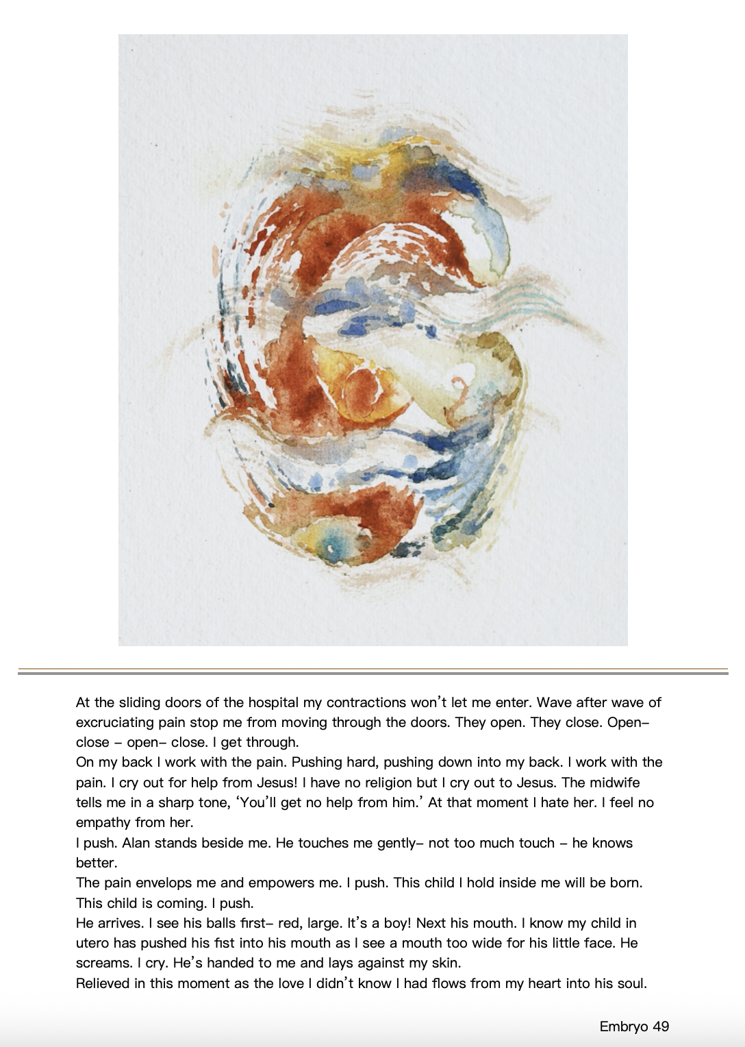 Each embryo is painted with watercolour on 20 × 20 cm Khadi paper. The project began during my own transition into the new identity of a mother and through natural conversations with other mothers about their birth stories. These intimate and profound exchanges are encoded into each embryo—each form encapsulates the story, the way it was told, and the energy it holds.