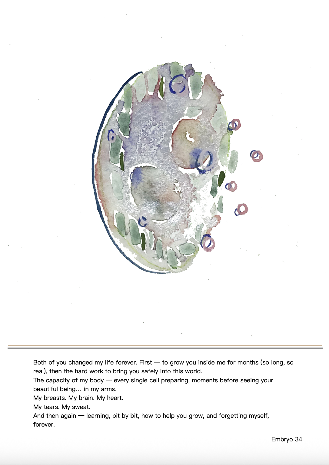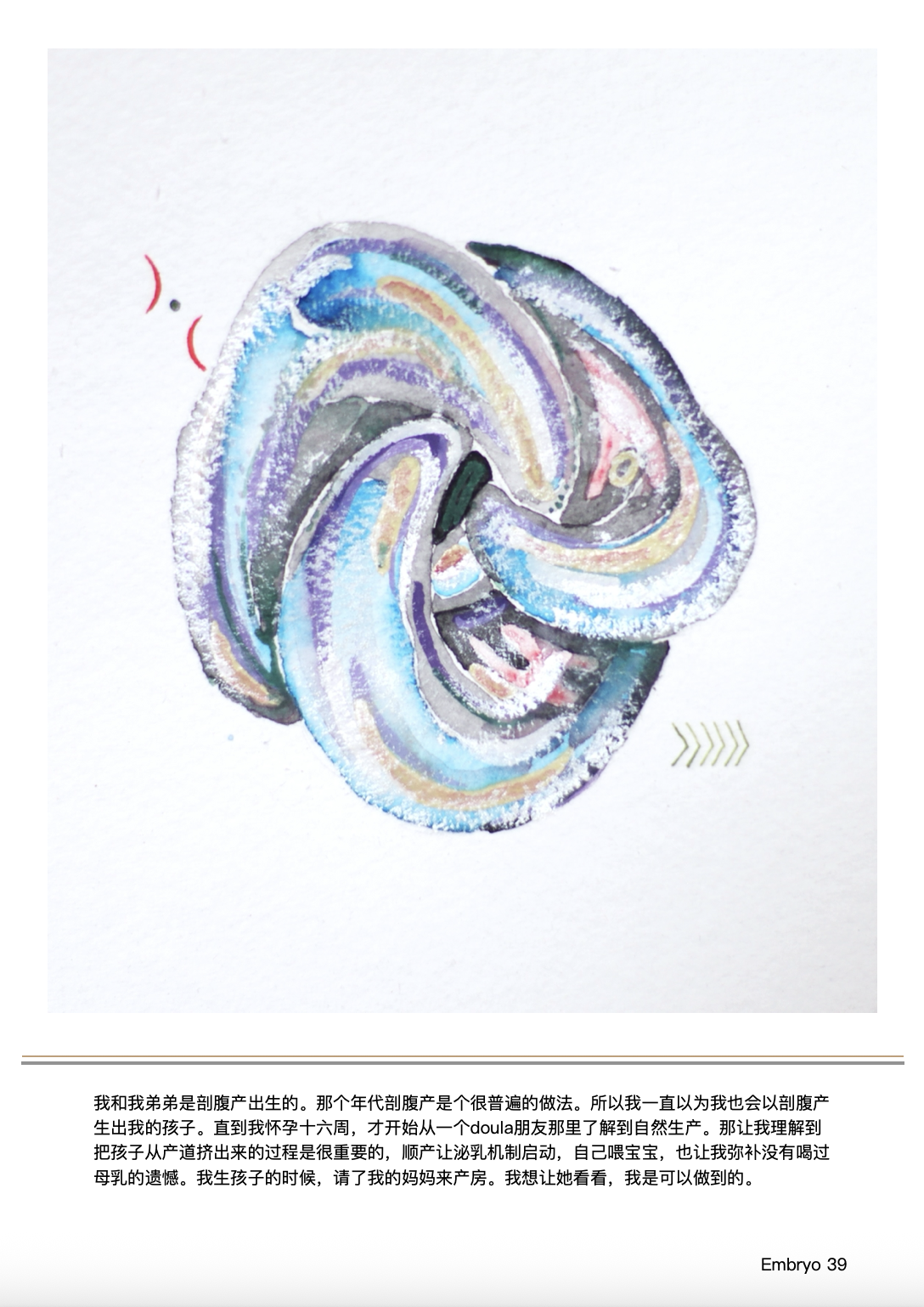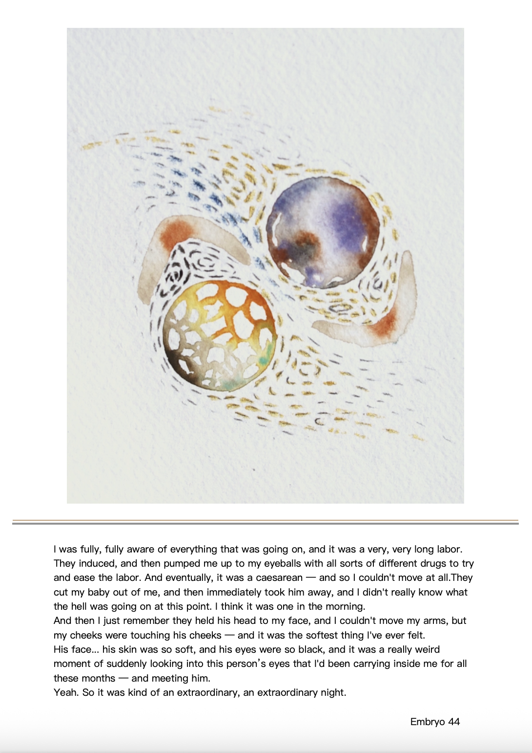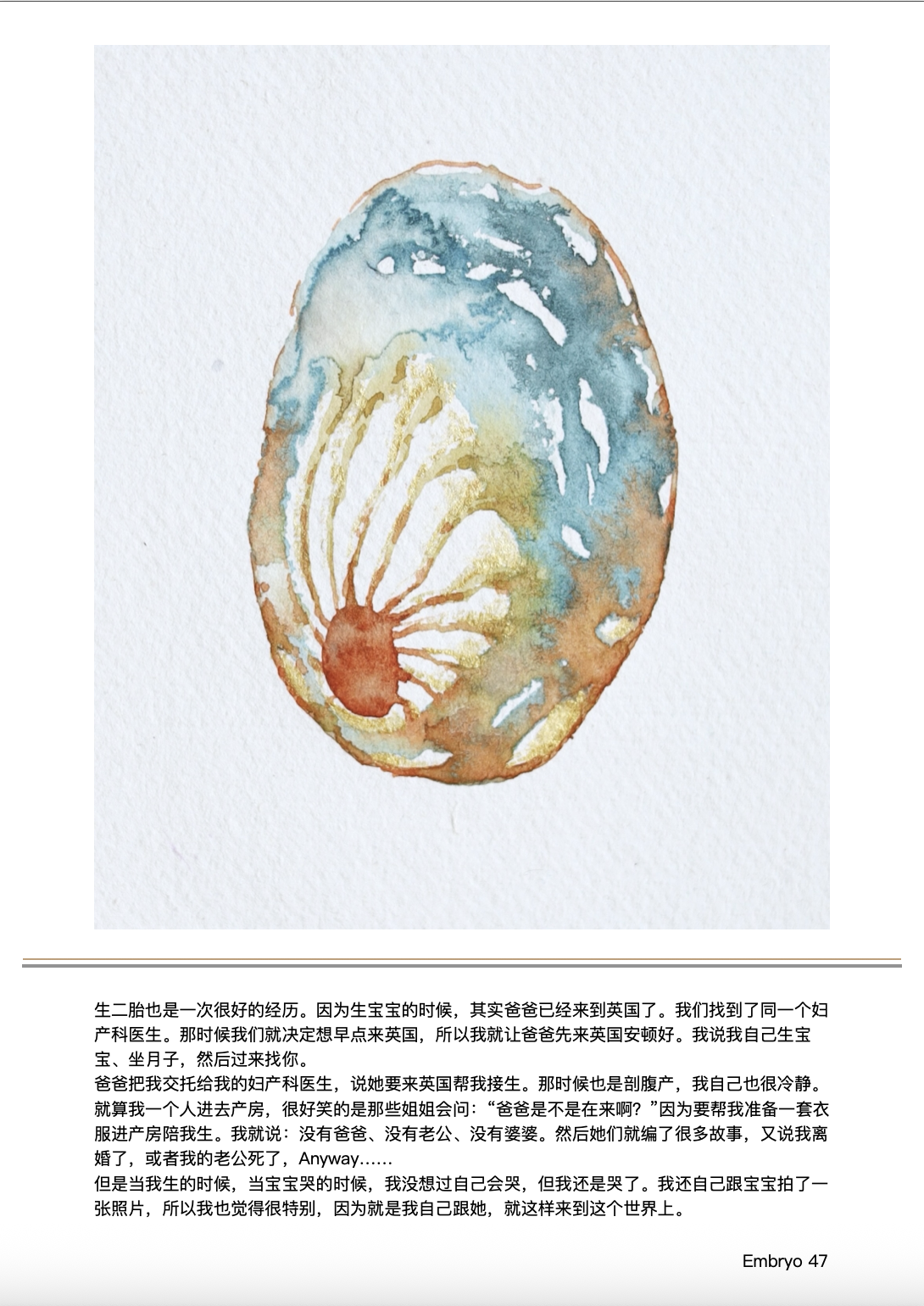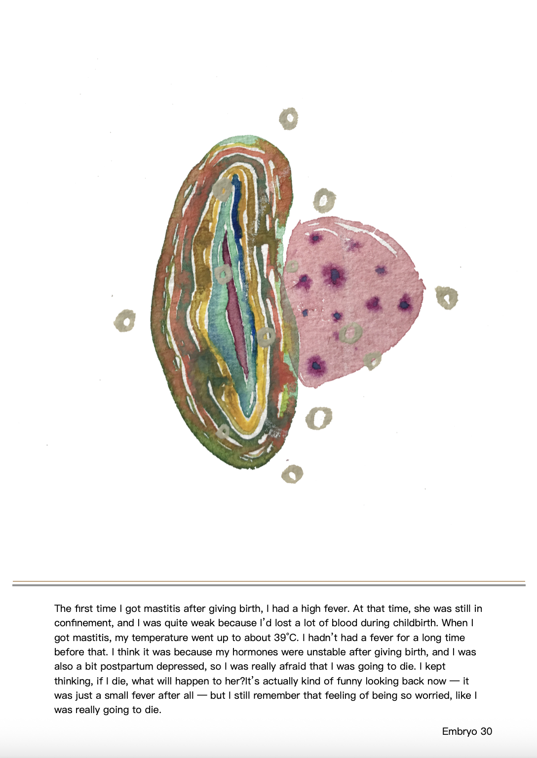 I hope to continue developing my ongoing project Embryos (2019–present), a body of work exploring motherhood and storytelling. In this series, I paint portraits of participants’ stories about giving birth, not giving birth, being born, and spiritual rebirth, visualizing these experiences as symbolic “embryos.”