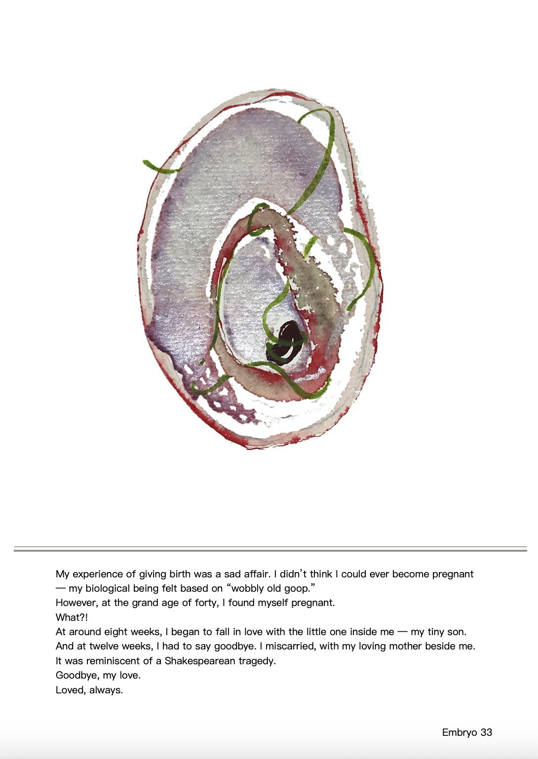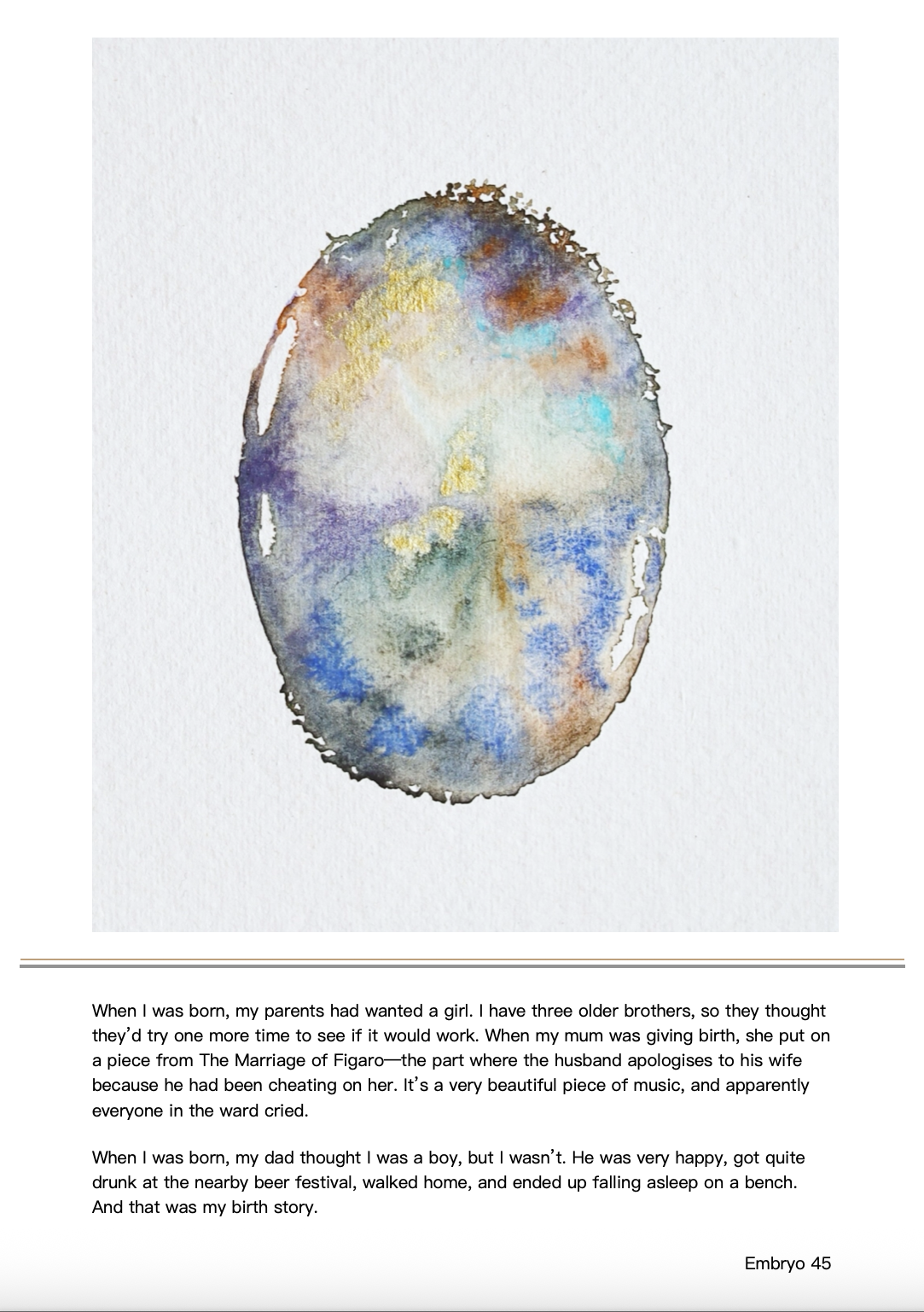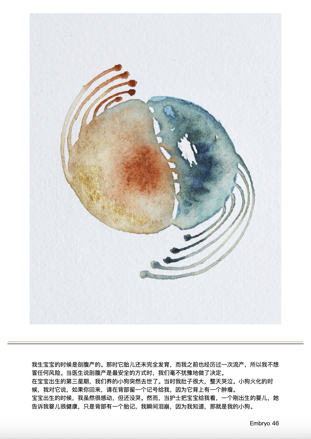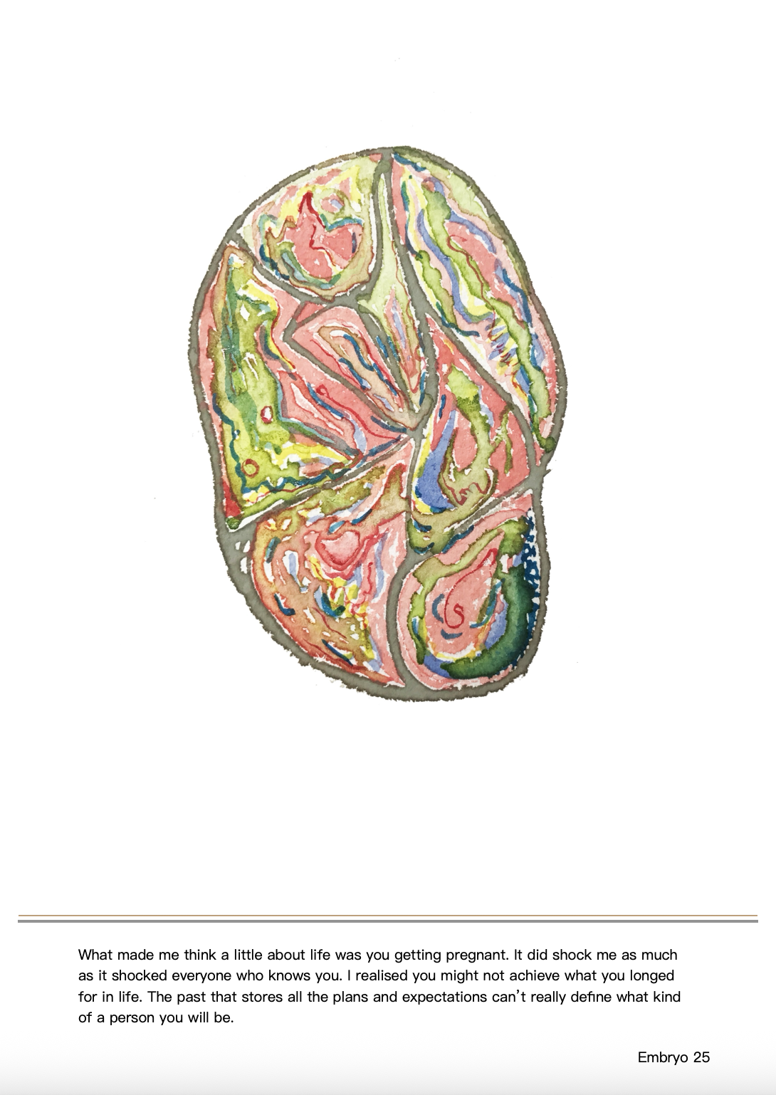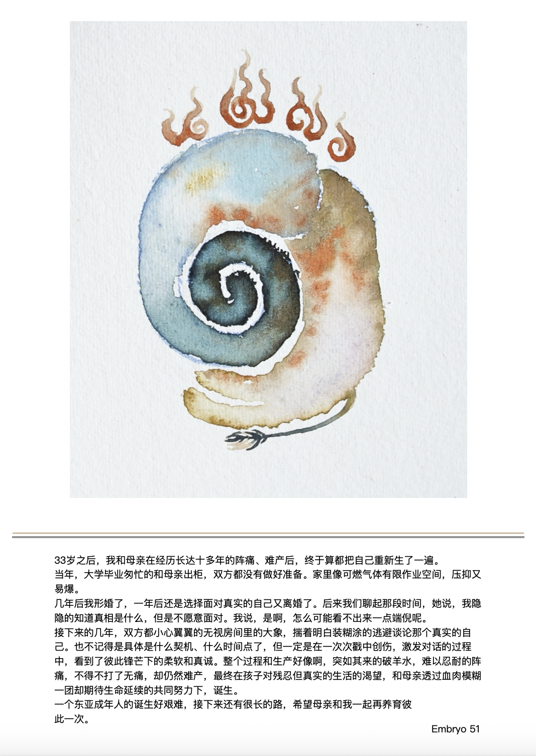 I hope to continue developing my ongoing project Embryos (2019–present), a body of work exploring motherhood and storytelling. In this series, I paint portraits of participants’ stories about giving birth, not giving birth, being born, and spiritual rebirth, visualizing these experiences as symbolic “embryos.”